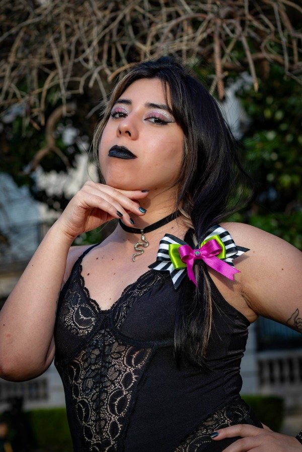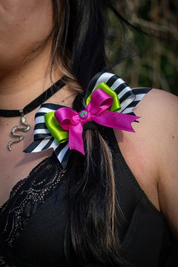 Moño de cinta raso pegado y cosido a mano, con aplique de porcelana fría pintada a mano